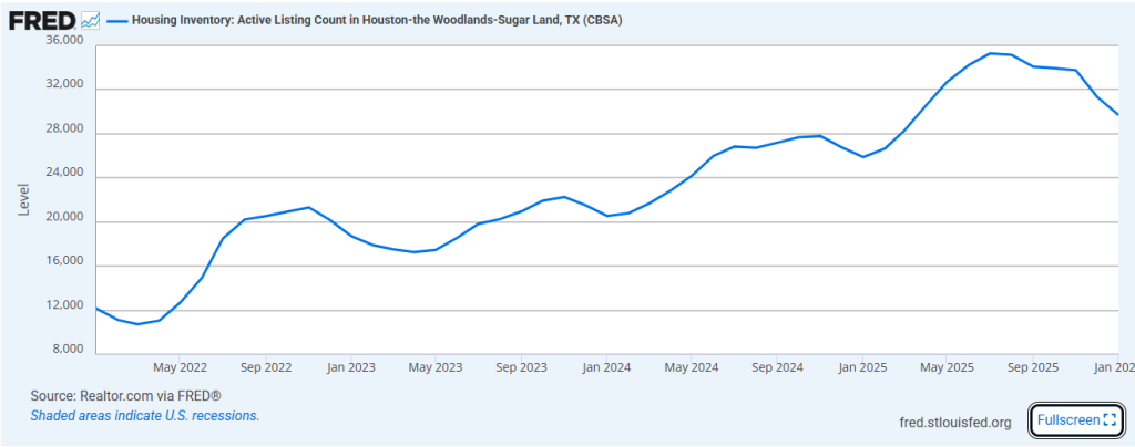 Realtor.com, Housing Inventory: Median Days on Market in Houston-the Woodlands-Sugar Land, TX (CBSA) [MEDDAYONMAR26420], retrieved from FRED, Federal Reserve Bank of St. Louis; https://fred.stlouisfed.org/series/MEDDAYONMAR26420, February 25, 2026.