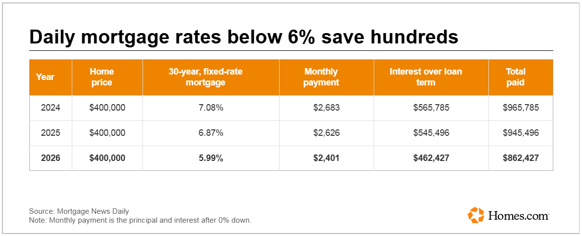- The 30-year, fixed-rate mortgage dipped to 5.99% on Monday — its first time below 6% since September 2022.